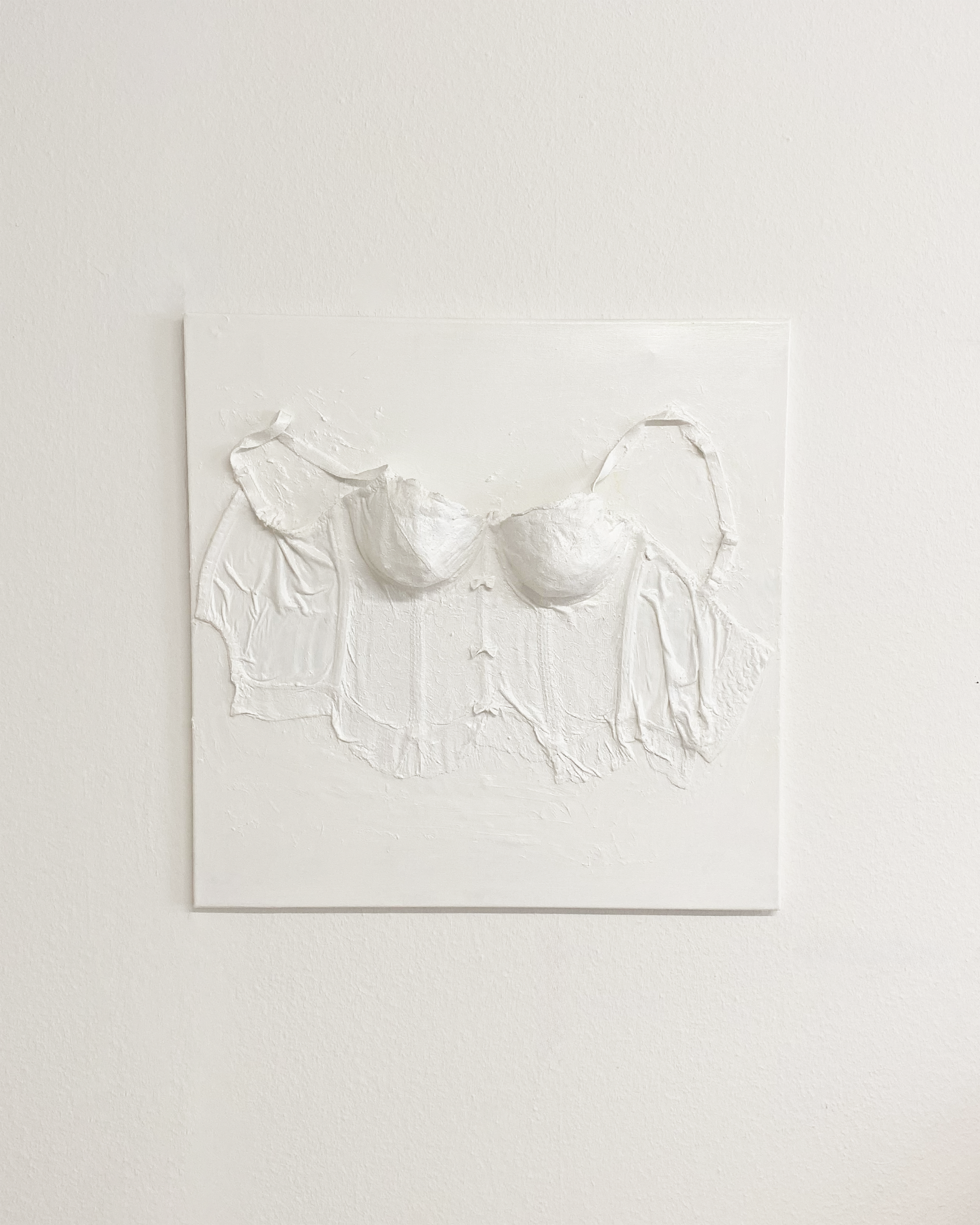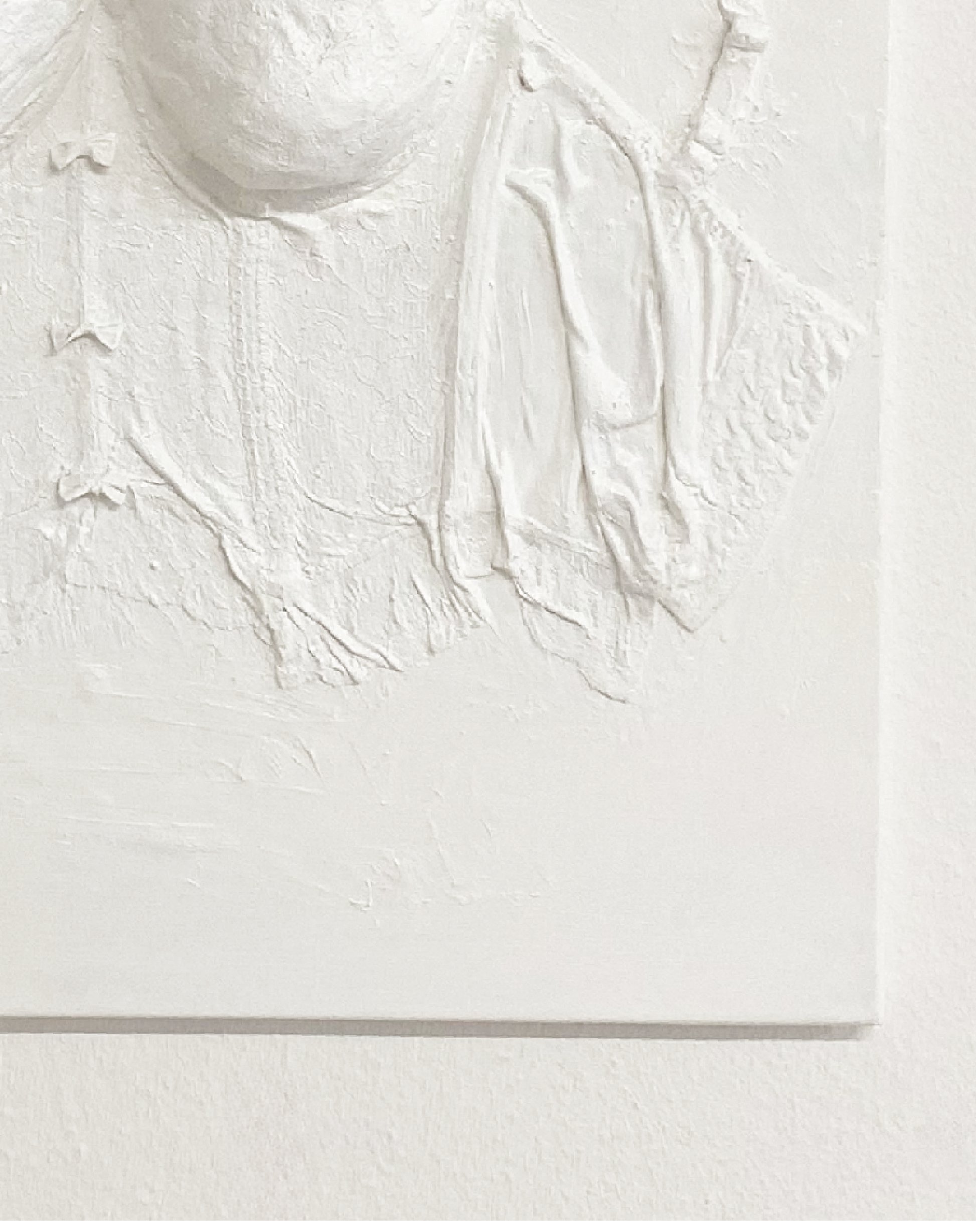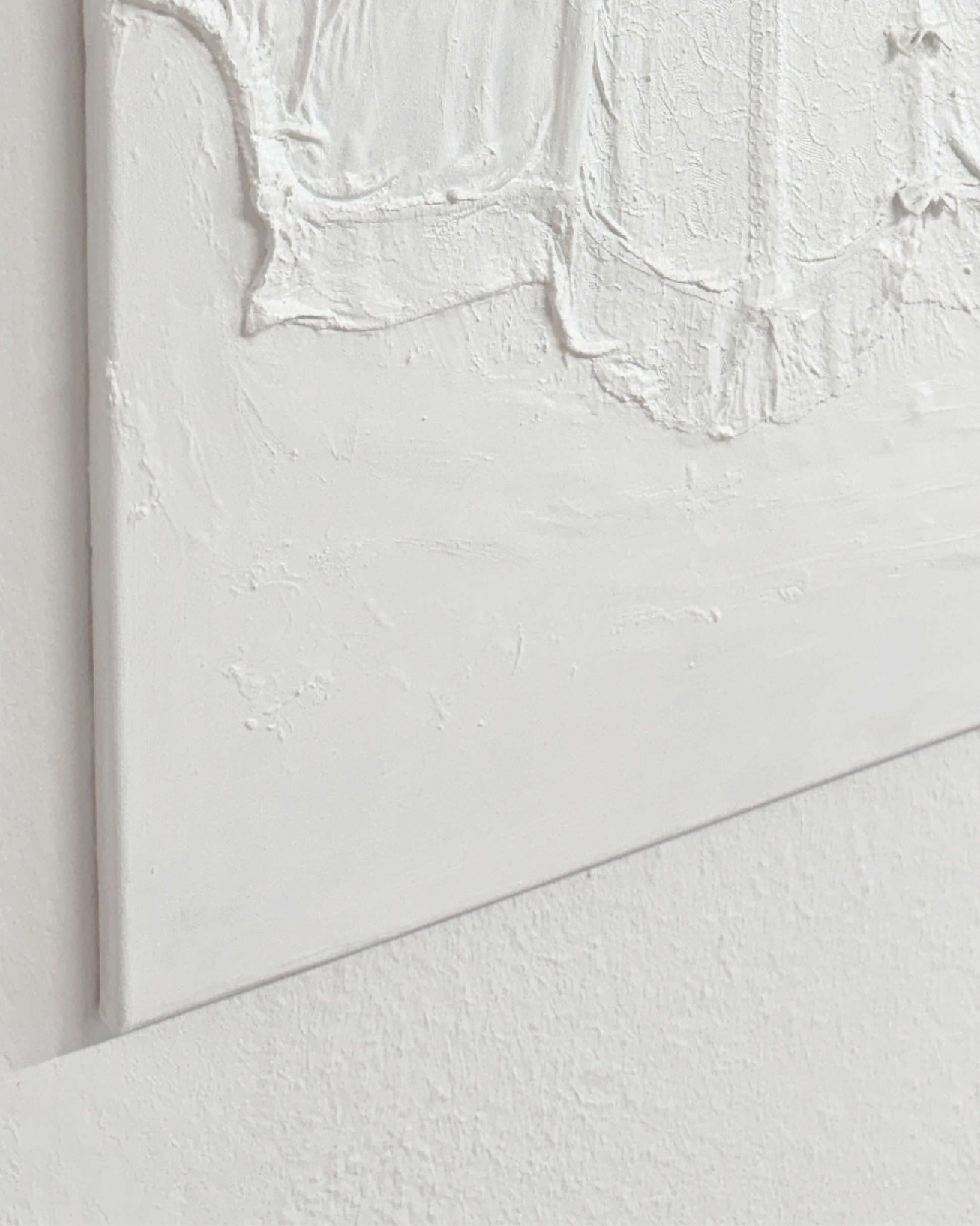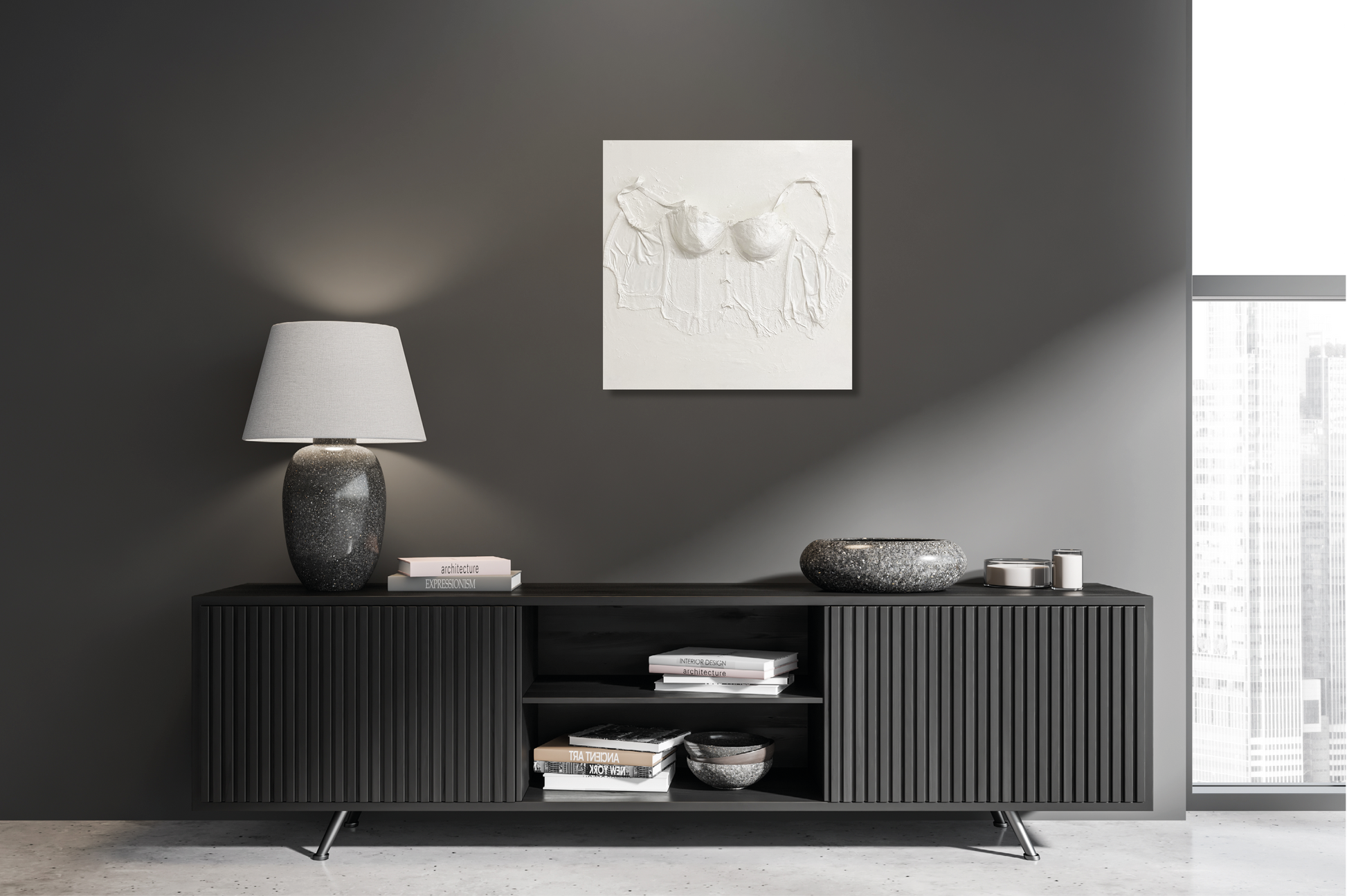 Es war an einem trüben Herbstnachmittag, als sie plötzlich vor meiner Tür stand, mit einem schlichten Beutel in der Hand und einem leisen Lächeln im Gesicht. „Vielleicht kannst du etwas Neues daraus machen“, sagte sie, griff in den Beutel und überreichte mir eine weiße Corsage, denn sie wusste von meiner Mixed-Media-Assemblage-Serie „Women´s Secret“. Ein intimes Kleidungsstück zart, getragen und voller Geheimnisse. In meinem Atelier begann ein stiller Dialog zwischen dem Material und der künstlerischen Umsetzung. Ich formte sie direkt auf die Leinwand. Der feine Spitzenbesatz, die vorgeformten Cups, die verspielten Träger, all das wurde Teil einer plastischen Erzählung über Weiblichkeit, Intimität und Vertrauen. Die weiße Farbe verstärkt die Ruhe des Werks, bringt eine fast sakrale Stille hinein. Die Leinwand wird zur Bühne eines eingefrorenen Moments, in dem das textile Material durch Acryl und Struktur zu einer skulpturalen Präsenz erhoben wird. Diese Corsage, ein Symbol von Weiblichkeit ist ein eingefrorener Moment, ein Zeugnis von Mut und Offenheit. Es lädt ein zum Innehalten, zum Fühlen, zum Nachdenken über die Hülle und das, was darin verborgen lag. Dieses einzigartige Werk ist nicht nur ein visuelles Statement, sondern ist lebendige Erinnerung daran, wie Kunst aus einem einzigen, stillen Geschenk entstehen kann. Was passiert, wenn eine fremde Geschichte plötzlich Teil deiner eigenen wird? Finde es heraus und sichere dir dieses Unikat. Ein Objekt, das berührt. Direkt. Tief. Echt.